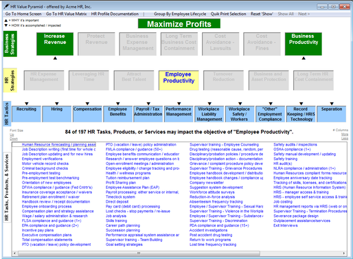 The $trategic HR Management $olutions software is the ideal tool for do-it-yourself, top-down teaching of HR’s impact on the P&L; prioritizing Strategic HR objectives; and choosing which granular HR things should be done to drive the plan.